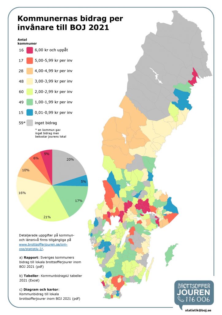 Brottsofferjouren gav under 2021 stöd till över 52 000 brottsoffer, anhöriga och vittnen från Sveriges alla kommuner och vid de flesta av landets domstolar. I BOJ:s kommunbidragsundersökning har samtliga 69 medlemsjourer svarat på frågor om bidrag från och avtal med kommunerna under verksamhetsåret 2021.