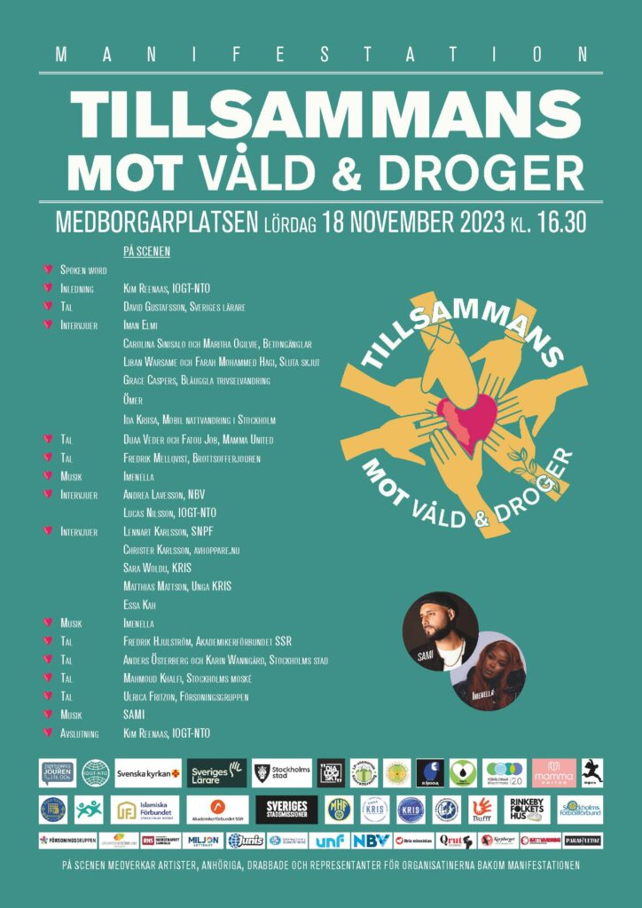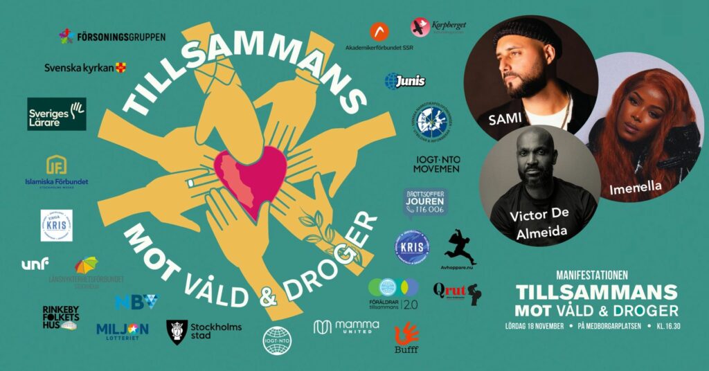 Därför har vi nu tagit initiativ till denna manifestation. Lördag 18 november klockan 16.30 samlas vi på Medborgarplatsen i Stockholm under parollen Tillsammans – mot våld och droger!