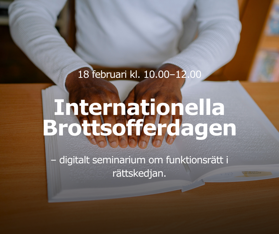 Den 18 februari kl. 10.00–12.00 arrangerar Brottsofferjouren Sverige ett digitalt seminarium om funktionsrätt i rättskedjan. Syftet är att uppmärksamma Internationella brottsofferdagen 2026 och lyfta aktuell kunskap, forskning och goda exempel om hur rättskedjan kan bli mer tillgänglig för personer med funktionsnedsättning.
